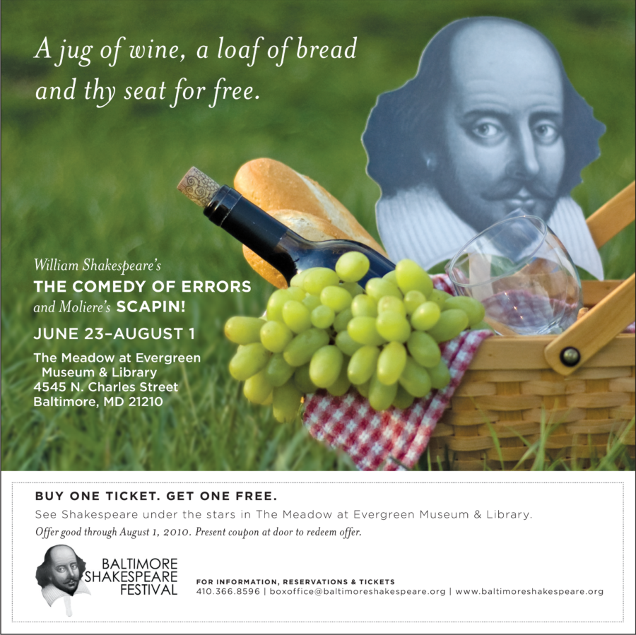 If swooning theater lovers are cooling their moist brows with your visage 500 years after your death, that’s a pretty amazing legacy. The Baltimore Shakespeare Festival (a beloved pro bono client) sold advertising to local businesses in the form of their names/contact info printed on the back of a cutout of Shakespeare’s head mounted on a stick. These fans were handed out at every show and became a fun tradition for diehards. When BSF received a free placement in the Baltimore Sun’s Reader Rewards, we knew exactly where to start. The ad’s BOGO ticket deal to get bodies in seats (or in the grass since the theater was outdoors) visually centers on the fan, and is designed around a headline paraphrased from Omar Khayyam’s Rubaiyat (we also styled and shot the photo). So the play may be the thing, but the fan? The fan’s THE thing.
